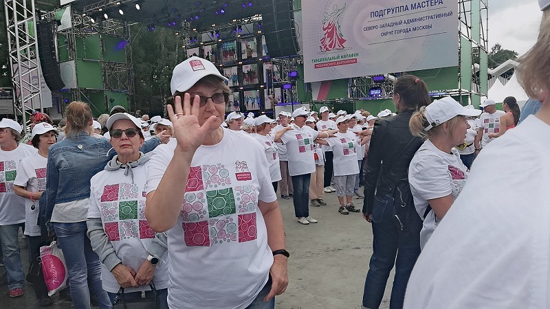 Девять долголетов из Нагатина-Садовников вместе с еще 1360 москвичами исполнили танцевальные движения во время телемоста «Танцуй, Москва, — танцуй, Россия!».