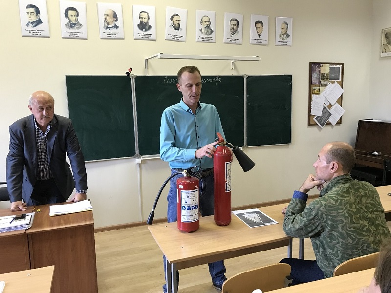 Предварительно заместитель директора по общим вопросам Сергей Золотухин провел инструктаж для педагогического состава образовательного учреждения: он рассказал о правилах эвакуации людей при пожаре и разъяснил порядок слаженных действий коллектива. Специалист по охране труда Олег Богданов ознакомил присутствовавших с пошаговой инструкцией по использованию огнетушителей.