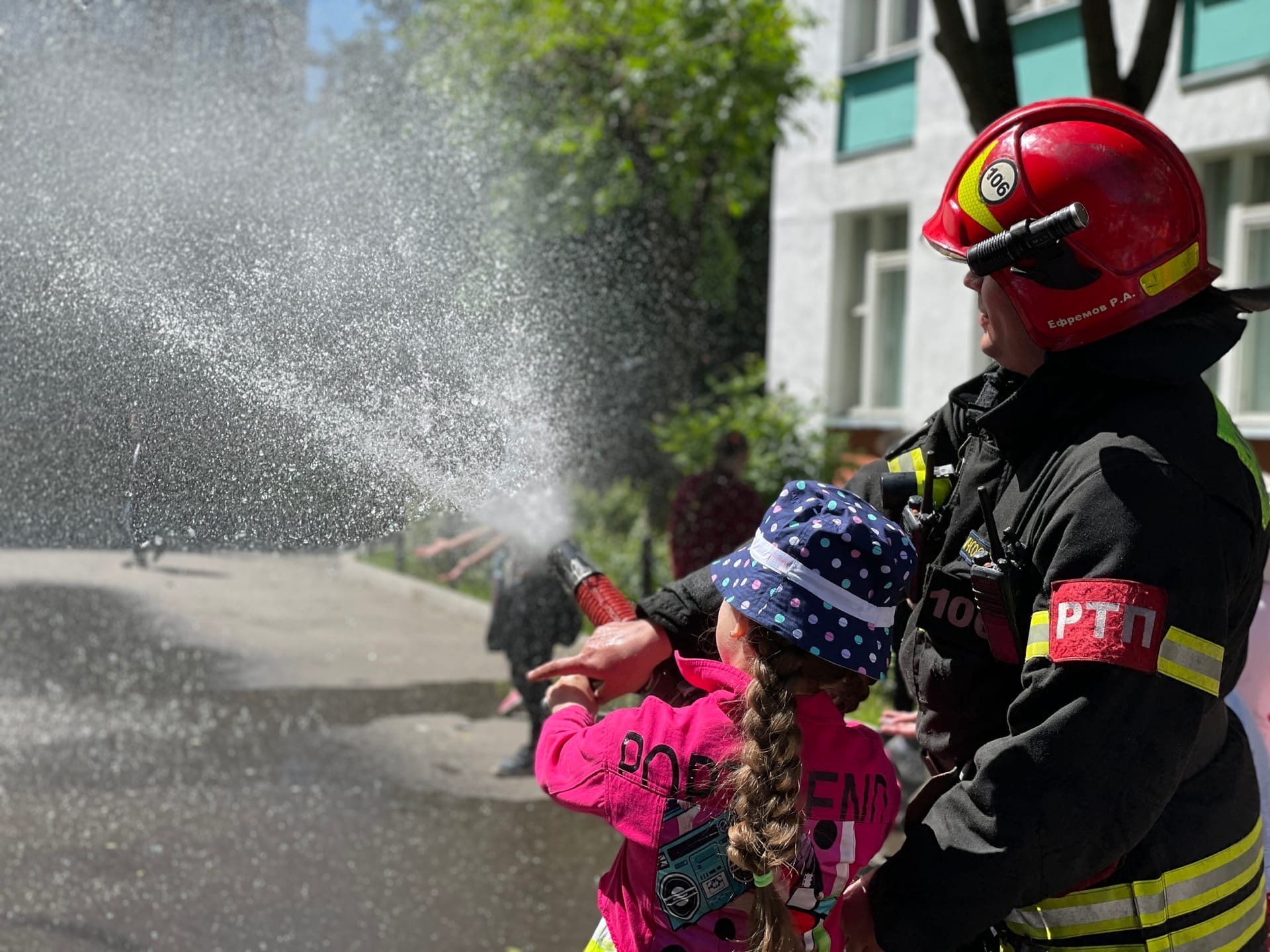 В завершении встречи пожарные устроили детям сюрприз, каждый желающий мог попробовать себя в роли пожарного и потушить условный очаг возгорания!