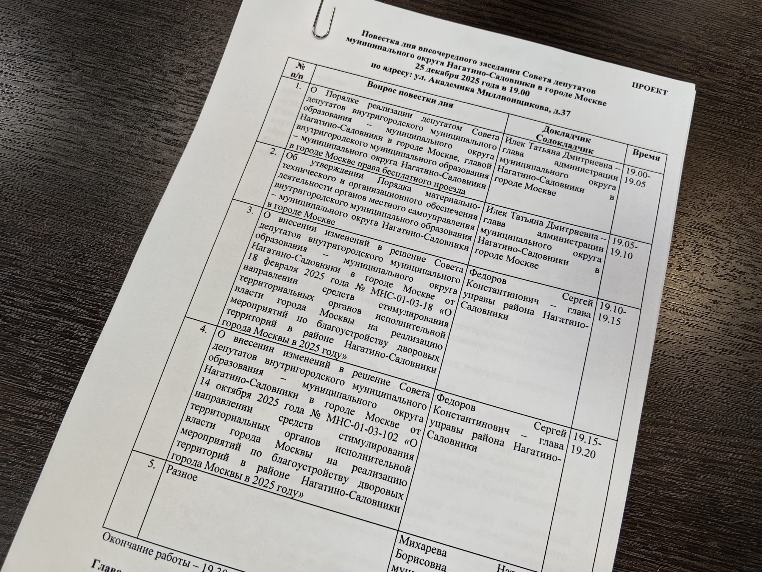 Заслушав Татьяну Илек, депутаты обновили порядок материально-технического и организационного обеспечения деятельности органов местного самоуправления МО Нагатино-Садовники, который действует с 2013 года. По следующим двум вопросам выступил Сергей Федоров. В результате по просьбе управы парламентарии внесли изменения в ранее принятые решения о направлении средств стимулирования территориальных органов исполнительной власти города Москвы на реализацию мероприятий по благоустройству дворовых территорий в районе Нагатино-Садовники в 2025 году.